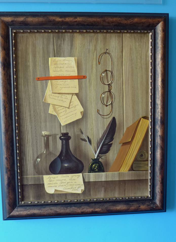 Stilleven van een Russische schilder. Echte Trompe l’oeil, waarbij het lijkt alsof de voorstelling op het schilderij driedimensionaal is. Het plankje met het papier dat uit het schilderij lijkt te steken, bevat eveneens de initialen van de schilder. Mooi geschilderde en boeiende objecten. Afmetingen circa 50 bij 60 cm.