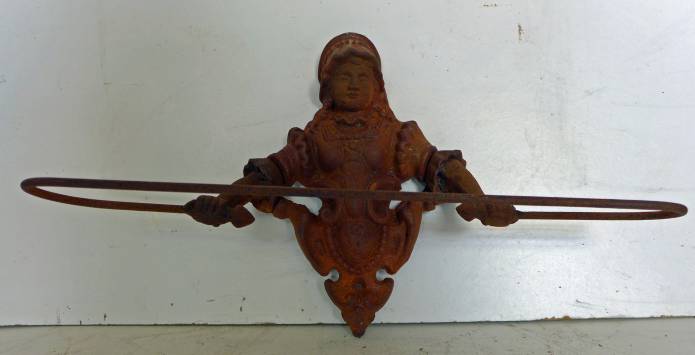 Gietijzeren beeltenis van een vrouw die met haar handen de uiteinden van een handdoekenrek vasthoudt. Geheel gemaakt van gietijzer. Periode rond 1920. Gemakkelijk te bevestigen aan de muur. Pittig stukje handsmeedwerk. Het object is wat oppervlakkig roestig, maar dat is zo te verwijderen.