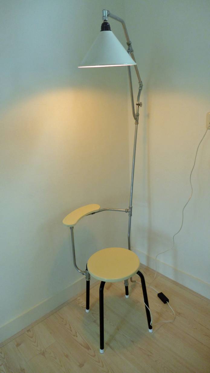We zouden dit een Leesstoellamp kunnen noemen, in ieder geval een Cosy Reading Chair, gemaakt met behulp van een stevige metalen constructie, waarbij een hoge lamp goed - naar keuze - op het boek of de e-reader schijnt. De lamp is dimbaar, waardoor gestreefd kan worden naar een optimale lichtbron ten behoeve van het genieten van de lectuur of literatuur.